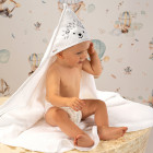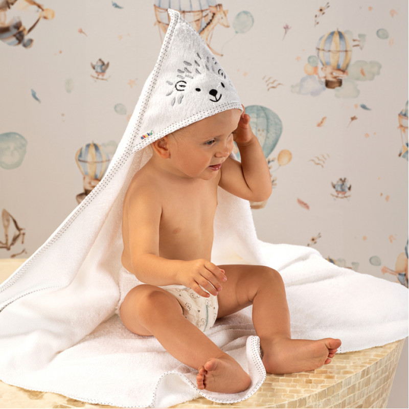 baby from getting cold. The sewn-in hood keeps the wet head warm.