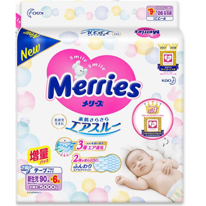 Japanese diapers Merries New Born 0-5 kg. For smallest babies (up to 5 kg). Light and comfortable Merries newborn diapers will give the pleasant feeling of comfort for every baby. The inner layer of diapers made from soft cotton and contains natural extract that protects the baby skin from irritation.
