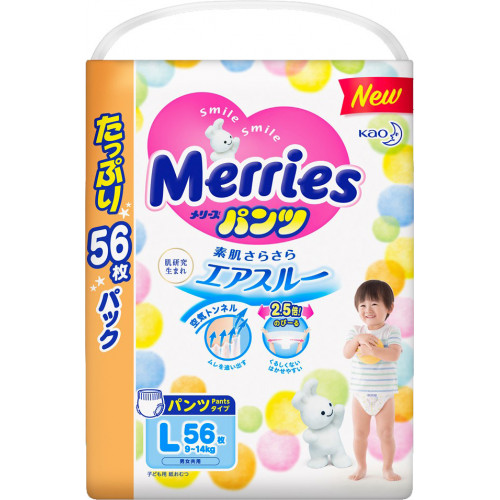 Merries PULL-UP nappies PANTS PL 9-14 kg. Diaper panties Merries look like baby’s underwear and they will perfectly suit the period when the baby learns to go to the toilet. The diapers contain soft cotton wool. For dry skin, comfort and breathing surface you should choose Merries!