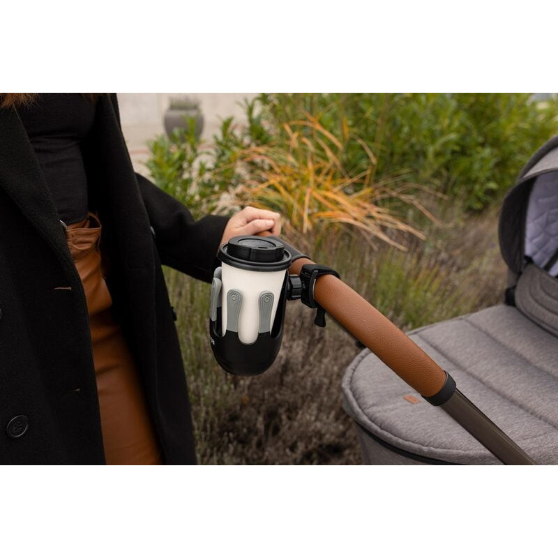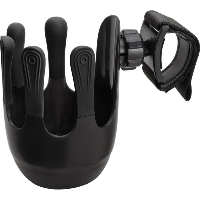 The flexible cup holder is designed to fit baby bottles, coffee cups and larger water bottles up to 8.5 cm in diameter. The 360° rotating system can be attached to the handle of almost any stroller thanks to the easy installation with Velcro. The unique, modern-looking five-finger system ensures better stability of the cup or bottle, preventing accidental spillage.