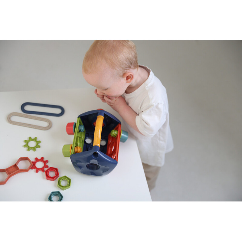 Tolo Bio is a bright and fun tool set for little engineers! The set includes 14 different tools, including a screwdriver, spanner, long oval connectors, cross-head screws, bolts, nuts, and gears. The sturdy handle allows your little one to easily carry all the tools.