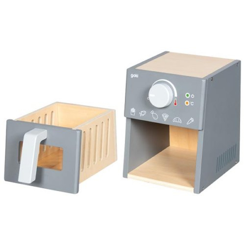 The air fryer features a child-safe design and is crafted to the highest standards, allowing little chefs to bring their culinary fantasies to life while developing motor skills and embarking on their first cooking adventures—all without electricity, making it completely safe. The set includes wooden accessories that offer a variety of options for young amateur chefs!