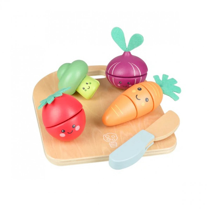 - 4 разных овоща, соединенных с помощью липучки, для легкости нарезки деревянным ножом.