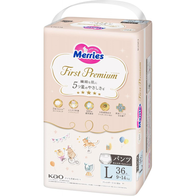 Japanese diapers-panties Merries First Premium PL 9-14 kg. For baby’s well-being and comfort the choice of diapers is very important, as the quality diapers can keep the skin healthy and dry, help to avoid leaks, giving the sweet dreams and the necessary freedom of movement. Merries First Premium diapers-panties are designed to meet all those requirements.