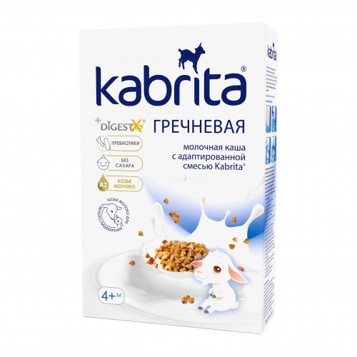 Kabrita® goat milk formula [skimmed goat milk powder, lactose, vegetable oils (rapeseed, sunflower, coconut), DigestX® fat complex (1,3-dioleoyl 2-palmitoyl triglyceride), minerals (calcium carbonate, potassium citrate, sodium citrate, calcium chloride, calcium phosphate, magnesium chloride)], buckwheat flour, lactose, hydrolyzed corn starch, skimmed goat milk powder, fructooligosaccharide (FOS-inulin), minerals (calcium carbonate, ferric pyrophosphate, zinc sulfate, potassium iodide), vitamins (vitamin B1 (thiamine mononitrate), vitamin C (ascorbic acid), vitamin E (Dl-alpha-tocopheryl acetate), vitamin A (retinyl acetate), vitamin PP (niacin), vitamin D3 (cholecalciferol), vitamin B12 (cyanocobalamin), calcium D-pantothenate, folic acid, vitamin B6 (pyridoxine hydrochloride), vitamin B2 (riboflavin)).