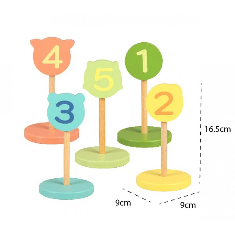 - 5 деревянных столбиков с номерами от 1 до 5, каждый с изображением лесного животного.